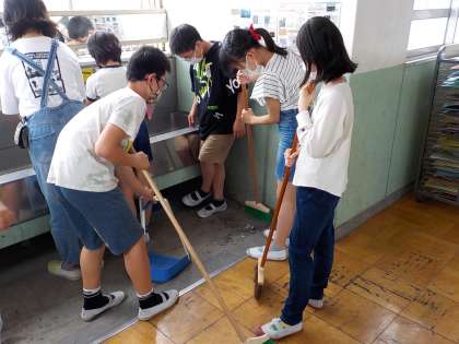 そうじの時間に6年生の廊下を見ると,手洗い場の下を丁寧に掃除している人がいました。