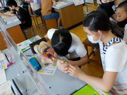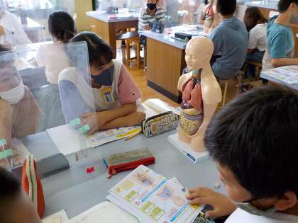6年生は理科で「体のつくりとはたらき」について学習しています。今日は,理科室へ行って,人体模型を使って人体の観察をしました。
