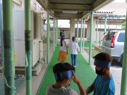 総合の学習で,アイマスクをしてどのような困りがあるかを体験しました。