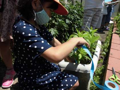 子葉が出てから大分大きく育った植物を観察しました。どれだけ高くなったのか紙テープを使って調べ始めました。
