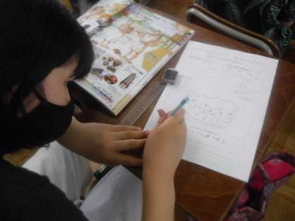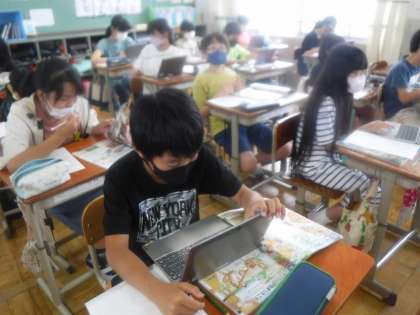 GIGA端末や資料集を使って模様や特徴を確認している様子です。実際に作ってみるのが楽しみですね!!