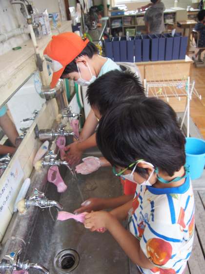 活動ごとの合間で手を洗っています。