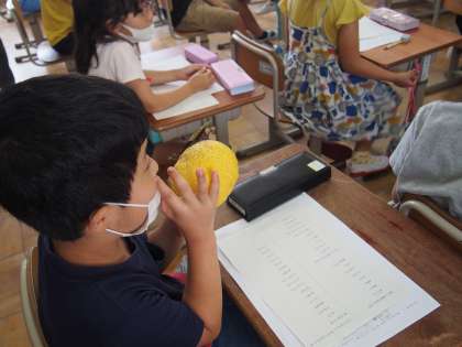 に実際に夏みかんをさわって,手ざわりやにおいを感じました。