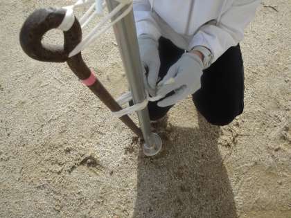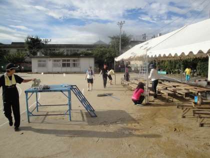 杭とテントをひもで結んだり,雑巾で水分を吸い取ったりしました。