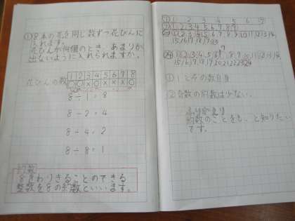 8本の赤い花と12本の白い花を,同じ数ずつ花びんに分ける問題を通して,約数の意味を考えました。