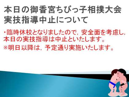 本日の実技指導は,台風による臨時休校のため,中止いたします。