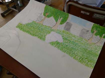 各クラス,それぞれ別の本の内容で絵をかいています。お話をきいてからイメージを想像し,それを絵にするのは,大変難しいです。がんばってかいています。