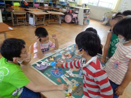 「すごろく」にたくさんの子が集まり,さいころをふり,コマを進め,