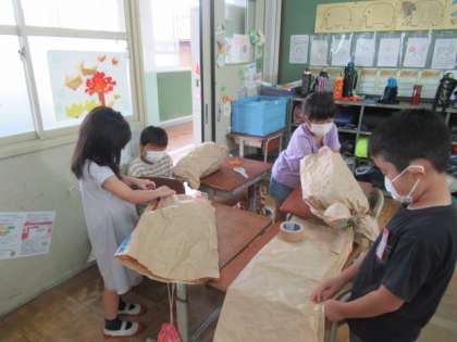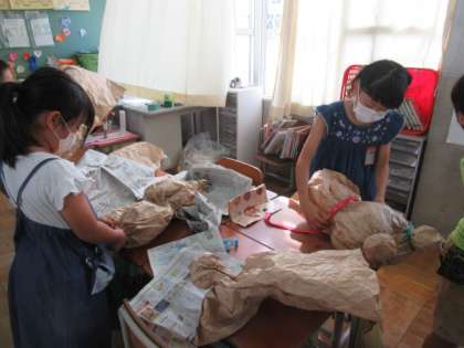 くしゃくしゃにした紙を丸めたり,ふくらませたり,ギュッとしたり。どんな作品になるのかな。楽しみです。