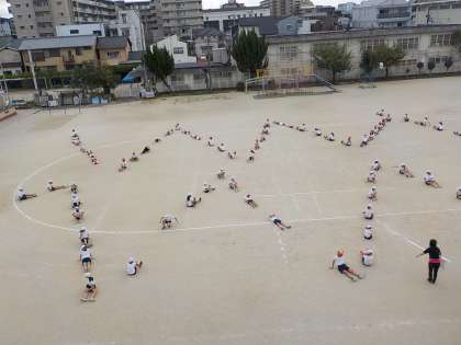 運動会で発表する集団演技にむけて頑張っている6年生。演技の中での体系移動について綿密に確認をしています。