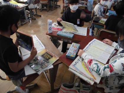 どの本がよいか,借りてきた本の中から話し合いを進めています。
