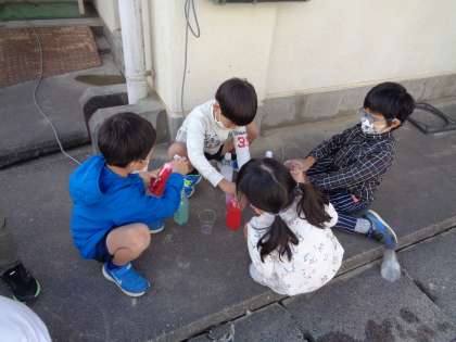 濃さや色合いがどのコップもちがったので,いろんなグループを回って色に見入ったり,逆に座り込んで,じっくり見比べたり…いろんな姿が見られました。