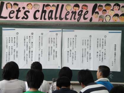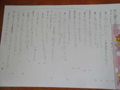事前学習として,歌詞カードに聞き取った言葉を記入し,歌の題名や意味を考えました。来週からは合同練習が始まります。素敵な歌声を響かせてくれることを期待しています。