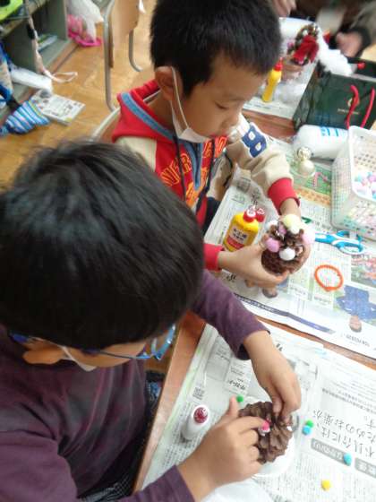 校外学習で拾ってきた松ぼっくりなどを使ってツリーづくりをしました。