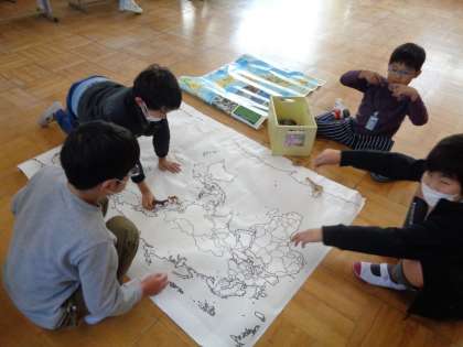 昼休みに世界地図を広げて,世界旅行あそびが始まりました。