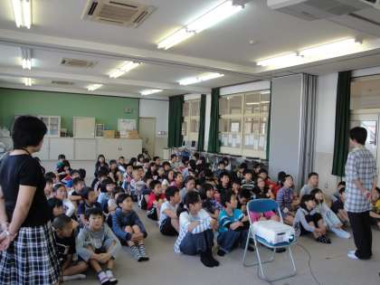 5年生は,もうすぐ花背山の家へ長期宿泊学習・野外学習に行きます。学年集会で,活動の大まかな流れと持ち物,野外学習のめあてについて考えました。