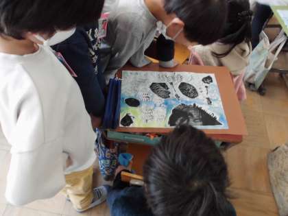 ようやく版画が完成しました。今日は,台紙に貼り皆で鑑賞し合いました。
