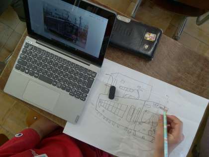 写真を見ながら,下絵をかいています。奥行きを意識して,かくようにしています。