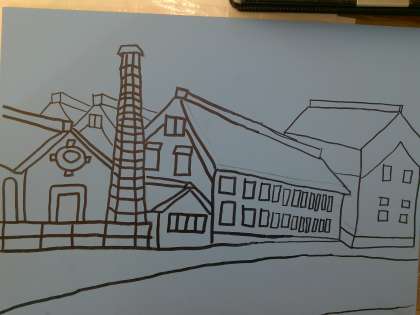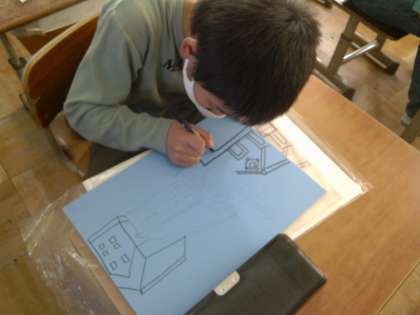 下絵ができた人から,木に絵を写して,ペンで太くしていきます。彫る線をはっきりさせるためです。ここが大切なので,真剣に取り組んでいます。
