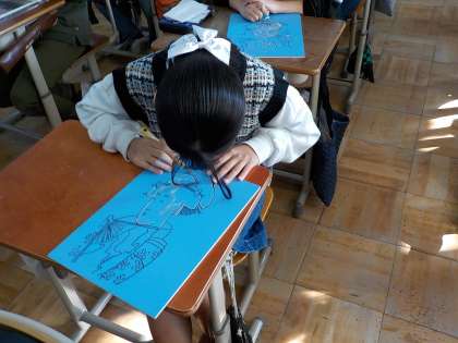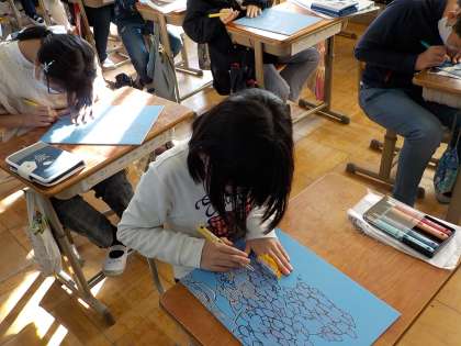 図画工作科の木版画で浮世絵に取り組んでいる6年生たち。