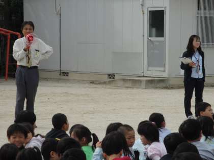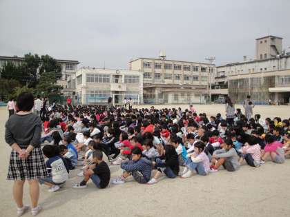 運動場で校長先生のお話を聞きました。「おはしもってて」はしっかりできたでしょうか。ご家庭でも聞いてあげてください。