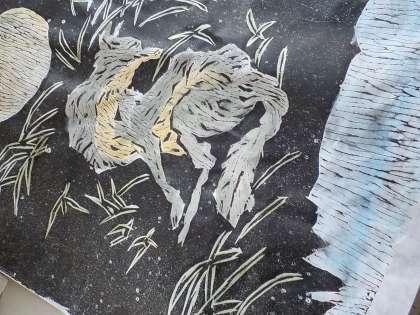 図画工作科の木版画で浮世絵に挑戦してきた6年生たち。