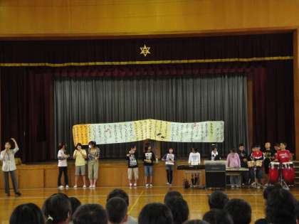 全校合唱で「レッツ・シング・ア・ソング」を歌いました。最後は,手拍子を打ちながら,合唱しました。