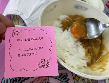 今日のカレーには、調理員さんからの「しあわせにんじん」のプレゼントが入っていました!「いいことがいっぱいありますように」と願いがこめられていますよ♡