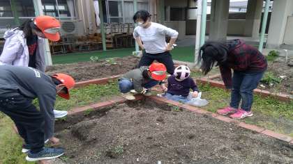 土を掘ると芋虫やさなぎがうじゃうじゃ出てきました。始めは怖がっていましたが,少しずつ興味を持って触る子もいました。