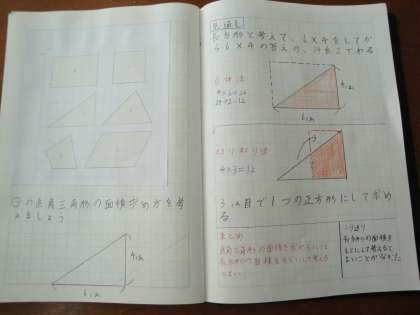 今までに学んだ面積の求め方をもとにして,直角三角形の面積の求め方を考えました。