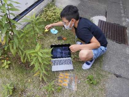 教室をとび出し,GIGA端末で写真を撮っている5年生。