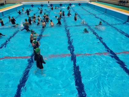 そんな日に2年生はプールに入りました。しかも今日は,前回の低水位ではなく,2年生たちのお腹ぐらいまで水があります。