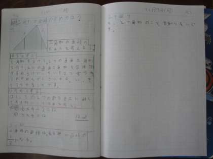 今までに学んだ面積の求め方をもとにして,三角形の面積の求め方を考えました。三角形の面積が長方形の面積の半分になっていることに,子どもたちは気づけました。