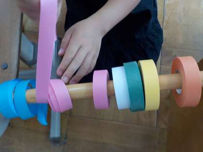 先週,カッターナイフで窓を開け,今週はその窓の向こうや外側に広がる世界をパスや紙テープなどを使って,描いていきました。