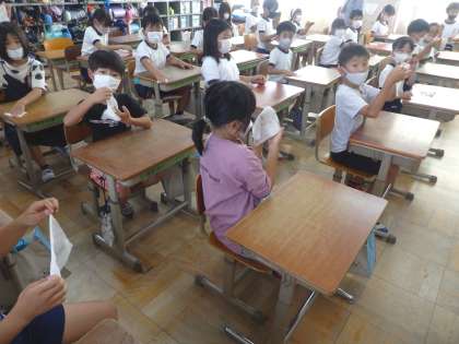 体重計測前の保健指導で,「できるところから,みのまわりを自分できれいにする」習慣を身に付けるために,自分の勉強机を除菌シートでふきました。