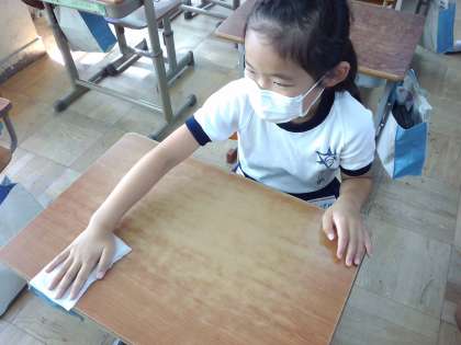 養護教諭の森先生に,手洗いの大切さと,掃除の大切にを教えてもらいました。机の上のふき方も教えてもらいました。