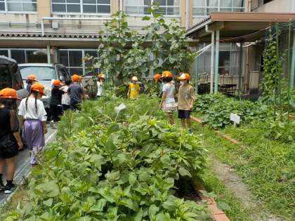 今日は,2回目の生き物探し。前回は,観察池や運動場で行ったことですが,今回は学年の畑です。