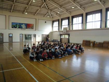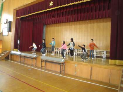 学年合同で,初めて体育館に入って練習をしました。自分の出番以外は,他の場面を見学し,自分の演技に活かしていました。