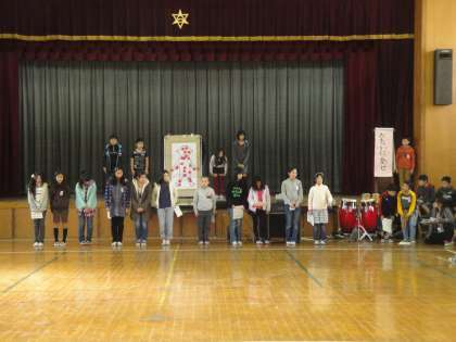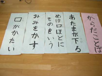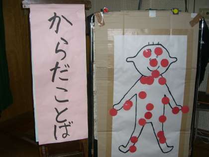 「使ってみよう!からだことば」をテーマに発表しました。からだは感じるだけでなく,気持ちや様子をあらわすときにも使えることを話しました。「頭がさがる」「目は口ほどにものをいう」「耳をかす」「口がかたい」について短い劇をまじえながら説明しました。他にもたくさんある「からだことば」を紹介しながら,からだの図に赤い丸をはっていくと,からだじゅうの「からだことば」があることがわかりました。