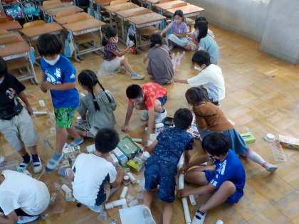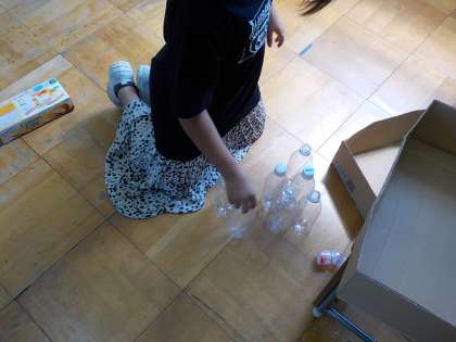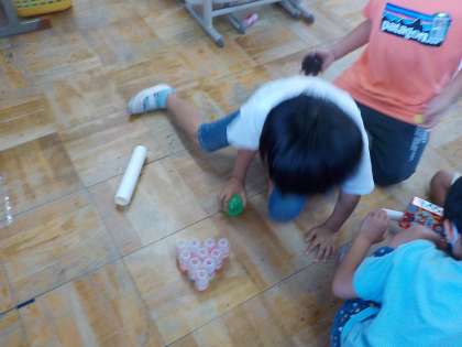 「転がしてみよっと〜!!」「あ,ペットボトルのキャップはむっちゃ跳ぶやん!!」など遊びながら気づいたり,発見したりしたことを声に出す姿が見られました。