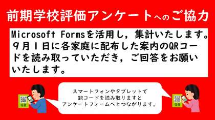 Microsoft Formsのアンケートフォームで学校評価アンケートを実施しています。9月1日付配布で,ご協力をお願いしたところ,現在約200件ほどご回答していただいております。アンケートフォームでの実施にご協力いただきまして,誠にありがとうございます。
