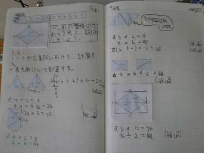 三角形に分けたり,平行四辺形にしたりして,ひし形の面積を求めました。最後に,長方形の面積の求め方から,言葉の式にまとめて公式を導きだしました。