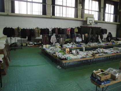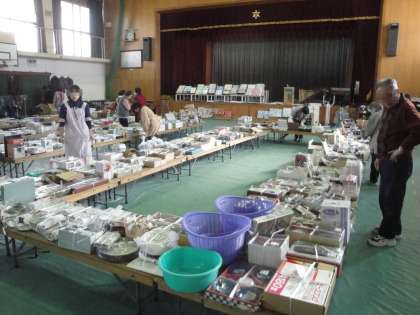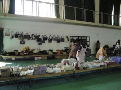 体育館で,女性会バザーの事前準備が行われていました。日用品や食器,衣服などが勢ぞろいです。