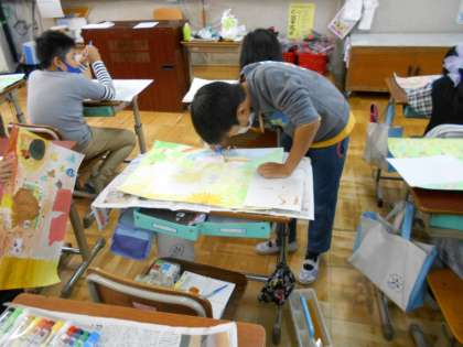 自分のイメージする色をパレットでつくっている子や少し立って離れたところから確認しながら描いている子など様々です。