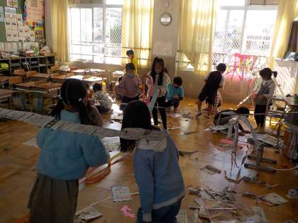 切った新聞紙やチラシをどんどん工作のりでつないで,つないで・・つるして,つるして・・。