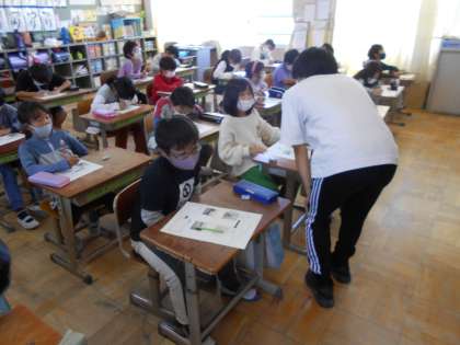 今日は、3年生と5年生で授業をしていました。実習生にとって1時間の授業を進めるのは大変です。週末も遅くまで残って教材を用意したり授業で話すことを準備したりしていました。