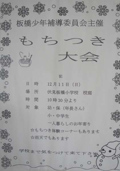 11日(日)本校にて,少年補導主催のもちつき大会を行います。雨天決行です。もちつき体験もできますので,お誘い合わせの上,お越しください。
