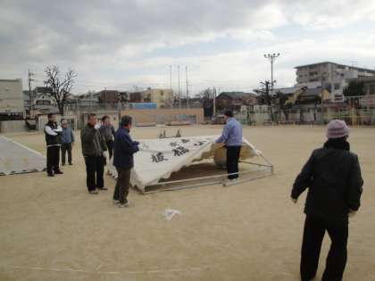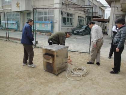 お昼過ぎ。明日のもちつき大会の前日準備が始まりました。テント,机,いすなどの設置に続き,機材類も運びこまれました。