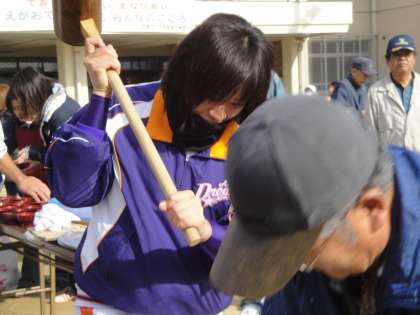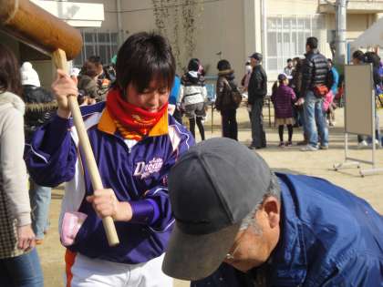 宮原選手と荒井選手もおもちをついてくださいました。リズミカルな動きは,さすがプロスポーツ選手です。