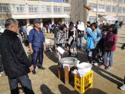 子どもたちももちつき体験をさせてもらいました。中には,初めてもちつきをする子どももいたようです。